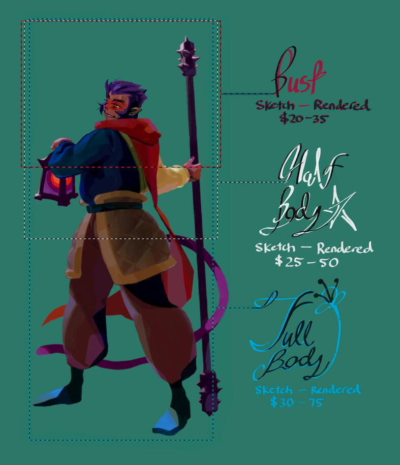 Because these prices are for rendered pieces, you may assume that sketches and flat colored pieces will be cheaper, just let me know and I'm willing to discuss prices!Examples of my work is below and included in my Cara portfolio!